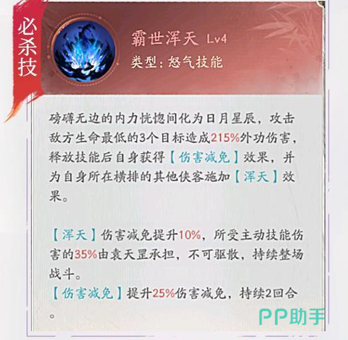 袁天罡的必杀技“霸世浑天”,从名字上就能感受到一股强烈的霸气,想象一下,那个给敌人带来绝望的瞬间!他会攻击敌方生命值最低的三个目标,造成215%外功伤害。可是,真正让人惊叹的,是技能释放的附加效果——袁天罡能获得伤害减免效果,还为自己前排的其他侠客施加“浑天”效果。这种效果的关键是让敌人无法轻易突破你前排的防线,它可以减免10%的伤害,并且每次敌方的主动技攻击,35%的伤害将由袁天罡承担。这种效果不仅不容驱散,还能持续整个战斗,并在两回合内增加25%的伤害减免,敌人无论怎么攻击都得考虑一下,自己能否穿透这座钢铁长城。