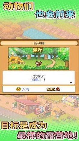 本作品以森林环境为主题,玩家作为娱乐场负责人,通过经营露营地完成收益任务。系统使用像素画质打造了优美的森林环境,玩家可以开辟荒地建造旅游设施,也可以添加各种商铺不断吸引旅客,各种帐篷的和垂钓区域都能获取收益。本游戏除了营地娱乐项目建造,也可以利用售卖露营装备扩展经营范围。