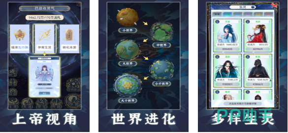 天道创造是拥有上帝视角的竖屏玄幻风格沙盒游戏,世界进化的沙盒主题玩法代入感自然更强,多元化的生灵都可以投放在天道星球上自由发展,多样化的文明延展性内容让本作更加硬核,无数个世界自由进化的特殊理念辨识度更高,这种融合了沙盒创造以及玄幻元素的游戏还真是不多见。