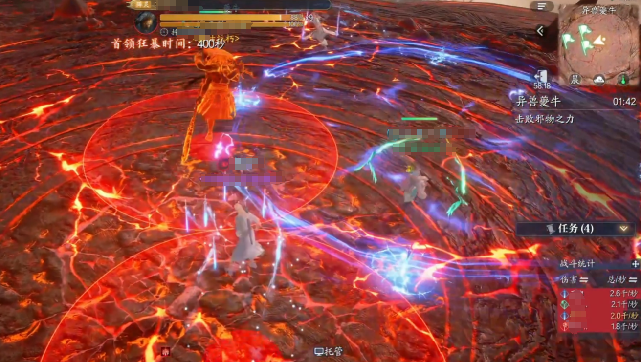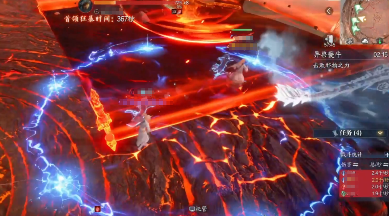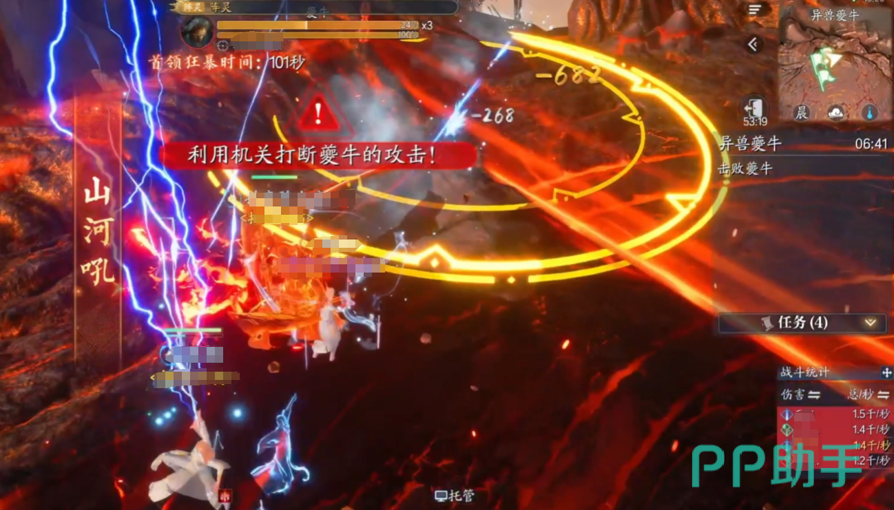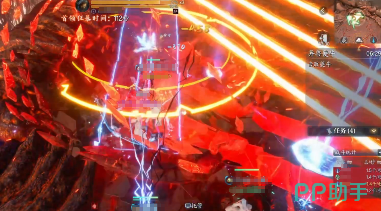 夔牛处于第一阶段(100%-80%血量)时,可以释放激光红圈:BOSS脚下生成激光和密集红圈,需分散躲避。另外还会生成黑洞立场:石头瞬移至随机玩家身边形成黑洞,需解控逃离。接着80%血触发陨石机制,随机点名2名玩家,需集合在牛头前让陨石落在一起。这时需要神祝(治疗职业)使用特殊技能4 将陨石推向BOSS,使其进入虚弱状态。