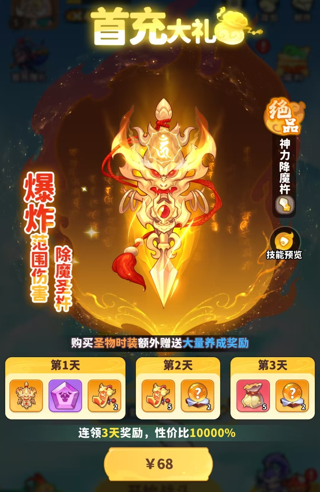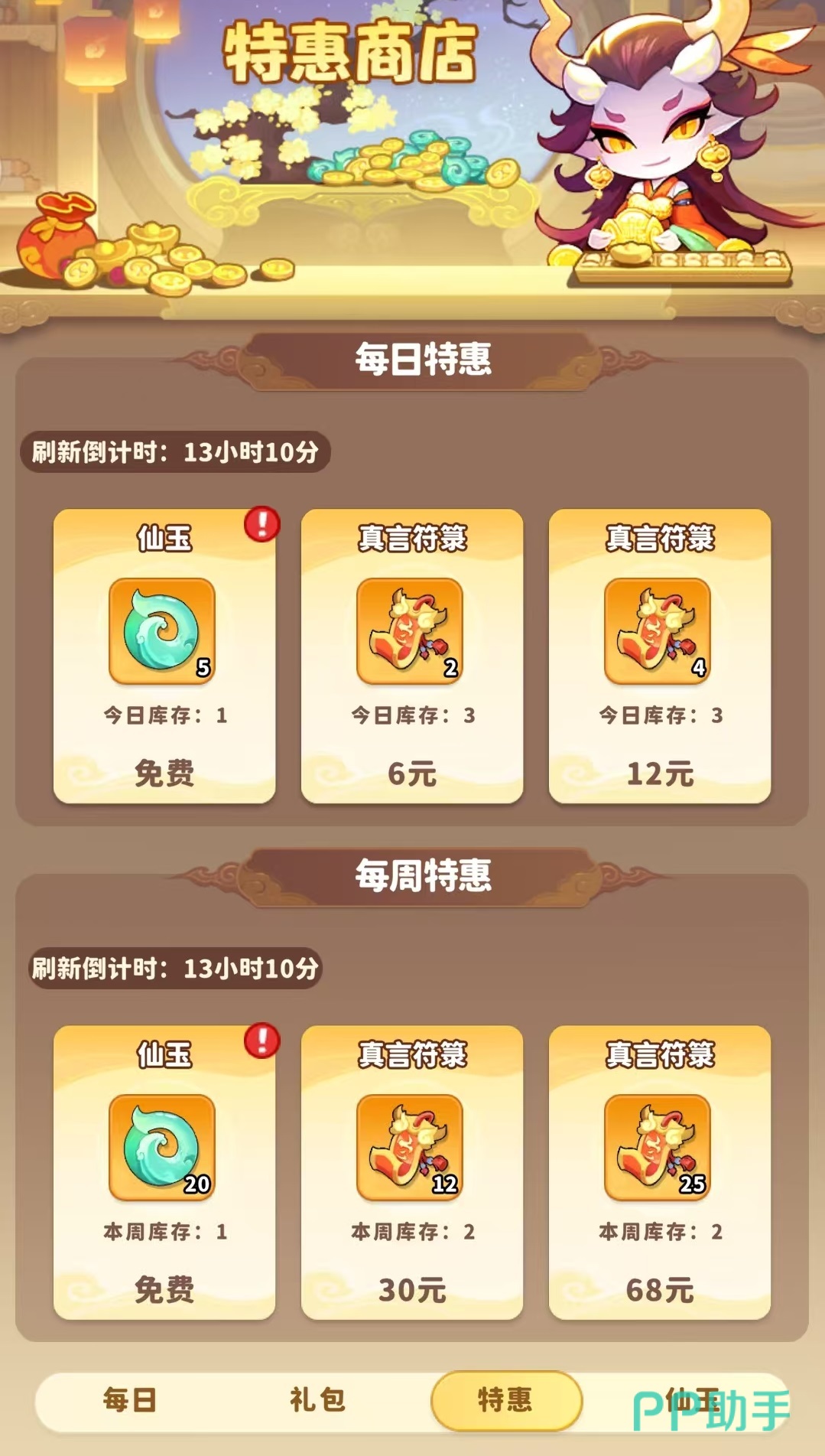 这款游戏现在刚刚开服,所以里面有着非常多的活动,这对于氪金玩家来说是拿资源的好地方。先来看一下最常规的内容。首先是首充一定要拿下,赠送的魔宠是前期推图的关键,然后是特惠商店,特惠商店中除了免费获得的资源之外,法宝乾坤袋、珍品宝箱钥匙的每月特惠购买性价比非常高,其次是每周特惠,每日特惠,建议氪金玩家也都拿下。然后将战令打开,月卡方面分为大月卡和小月卡,这两个月卡也都需要购买,一个月可以获得大量仙玉和多种特权,快速提升战力。