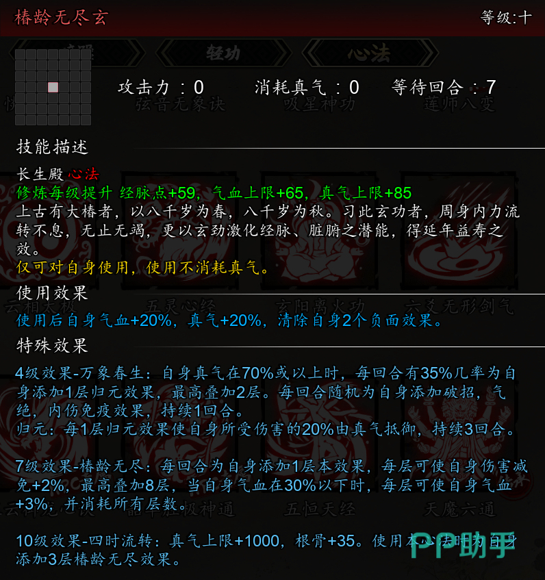 逸剑风云决椿龄无尽玄是一门红色心法,每回合随机在本回合为自身添加免疫破招、气绝、内伤效果,提供减伤效果,恢复气血。使用该心法可以回复自身气血+20%,真气+20%,清除自身2个负面效果。