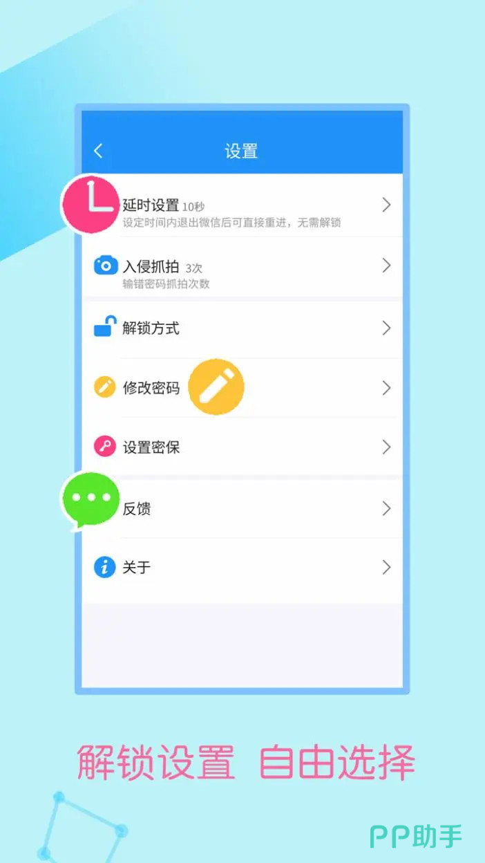 加密锁可以对一些特定的文件进行加锁,比如微信等,让私密聊天更家安全,加密方式有多种多样,有图形和密码解锁两种方式,另外,手机中装了一些不想让别人知道的app,加密锁可以通过图形伪装保护的方式,变成另外一个图标。