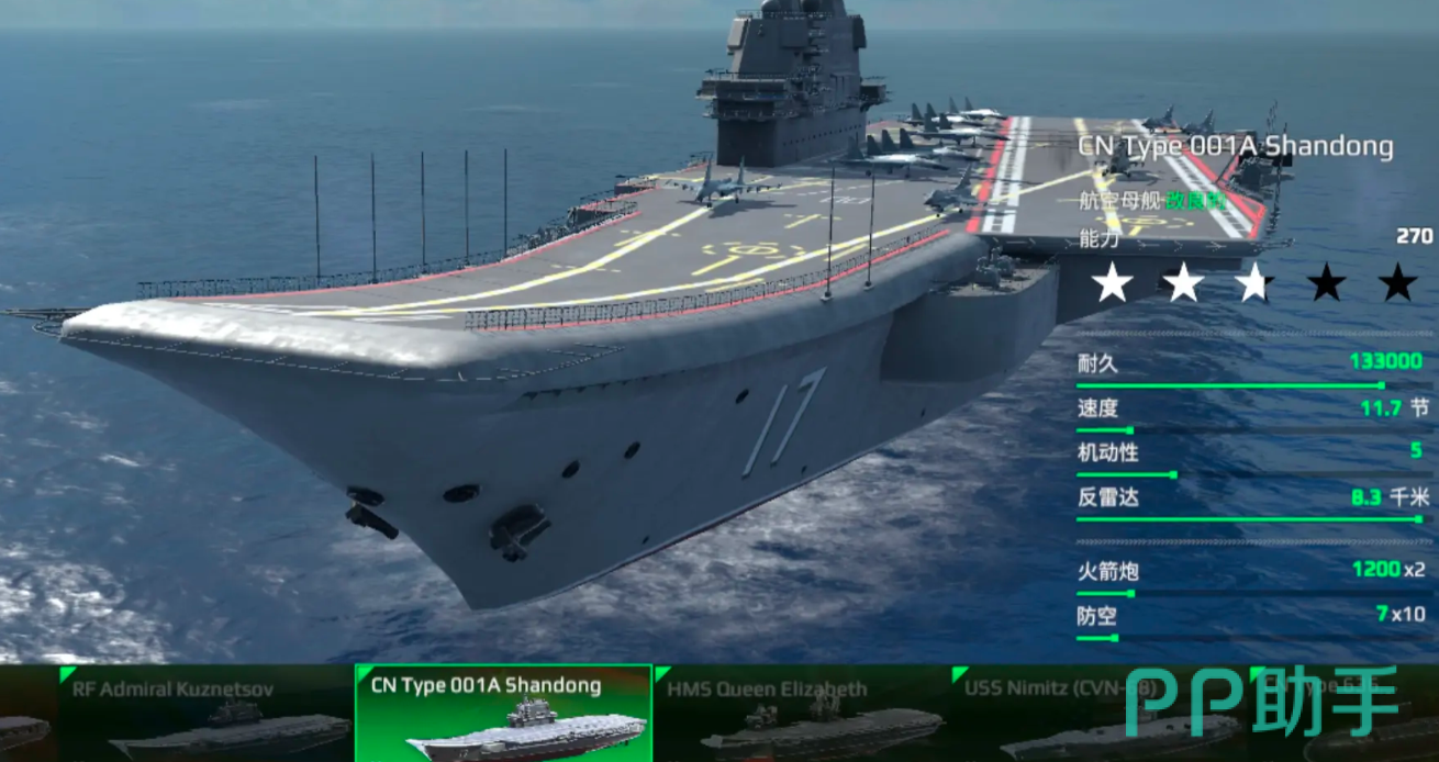 但同时,玩家一定不要购买二级航母,例如“山东号”,由于它们的输出比较低,战略定位重点,是在防御上面,对于前期的玩家而言,有碍于前期的资源刷取。