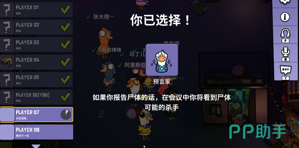 侦探是好人阵营的大鹅角色,也是让本阵营获得一些关键信息的重要角色,它的技能看起来是比较简单,就是能给本阵营揭露其他玩家的身份,找出隐藏的杀手,帮助好人更有思路的去排查,真正的鸭子到底是哪个玩家,技能效果就是直接查验玩家是否在本轮杀过人。