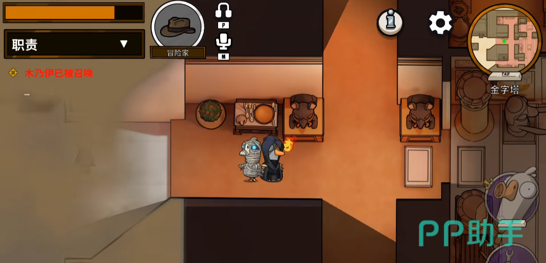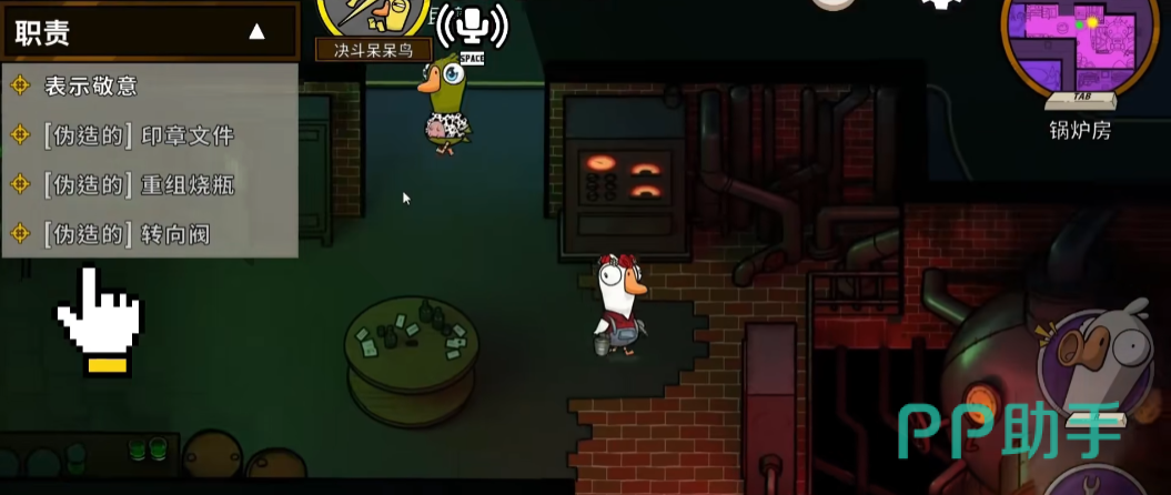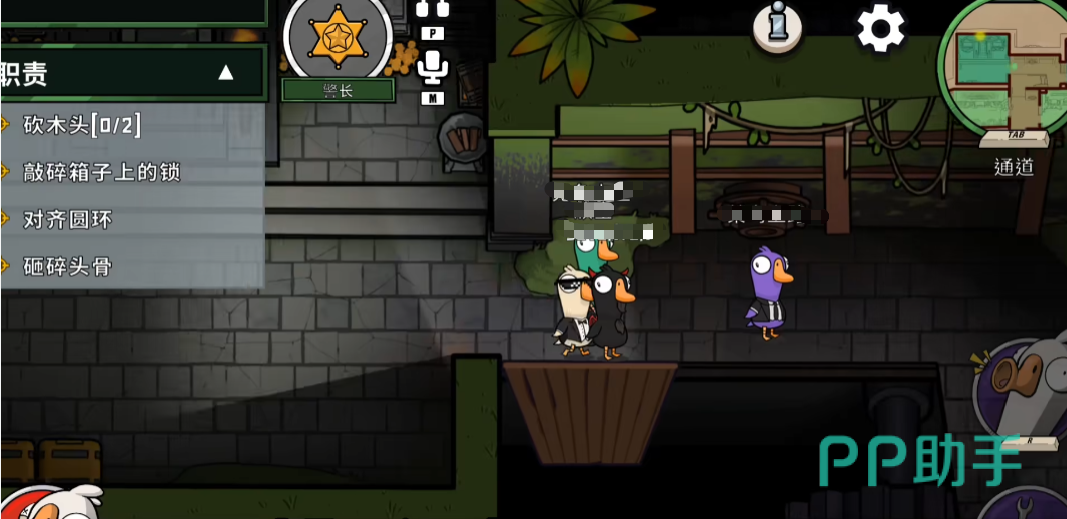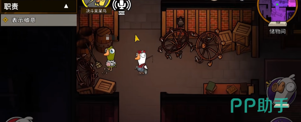 鹅阵营:角色能自由移动,屏幕右上方有个迷你地图,是可以放大的,大地图里面,写着各个位置的名称,黄点就是任务地点,左边的“职责”就是当前的任务,可以点击任意一个任务开启导航,跟着箭头导航就能去往任务地点了。任务完成时,任务栏会慢慢变多,任务栏填满,鹅就能胜利,当然也能淘汰鸭子取胜。