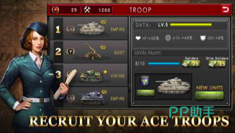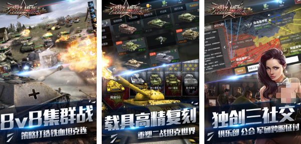钢铁雄狮,一款以二战为背景,打造的3d式卡牌策略手游,立体化的场景,丰富的坦克卡牌和主将卡牌,让玩家开启8v8的热血对战。独创的双社交模式,让玩家实现军队和工服同时跨服争讨,热血值直接飙升。王牌车长,开启更多专属技能,力挽狂澜。坦克数据以二战真实信息进行还原,打造高逼真战场模式。