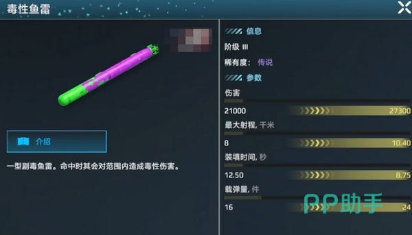 毒雷,一种装填时间极短、锁定速度极快的轻型鱼雷,攻击范围为10公里,装填仅需8.05秒,锁定时间更是仅为1.5秒。最大速度优于旗鱼,耐久也稍强,但单发伤害依旧不高,仅2.7万,AOE范围和伤害也不如旗鱼。实战中,毒雷的优势在于快速反复发射扰敌,而不是一发制胜。