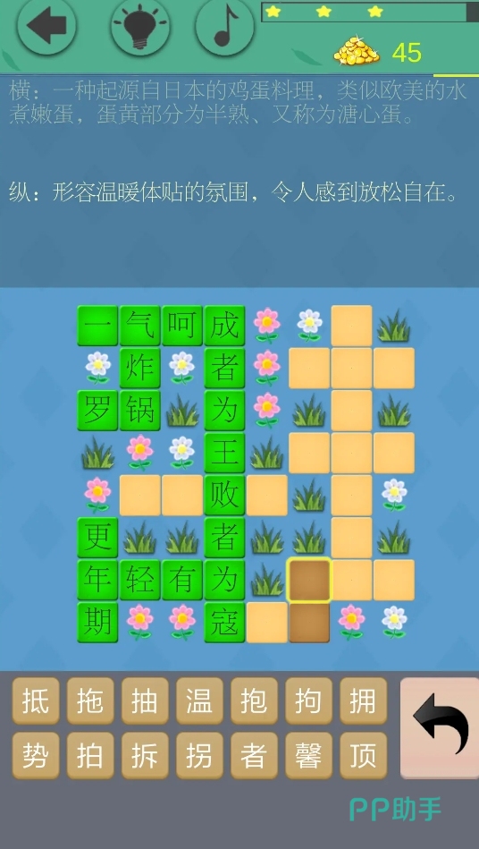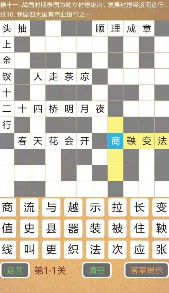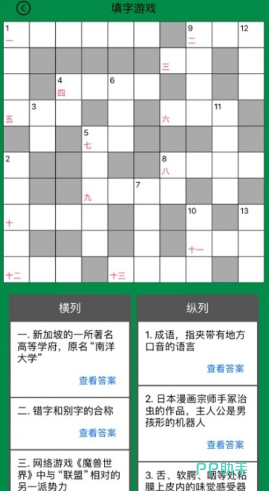 游戏会给出每一行、每一列的答案提示,并让人们将正确的答案以汉字的形式来填入空格,待所有空格全部填满且答案准确无误时,玩家就能顺利地去下一关卡继续自己的只是挑战。而且它每个提示都会标上对应的序号,让人们能清楚地知晓该提示的答案该填在哪个位置,当各位把握不住时,还能进一步查看提示获取答案信息。