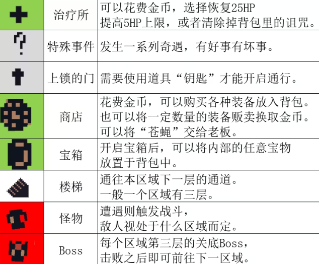 下图的这个图标代表的是上锁的门,大家需要使用道具“钥匙”才能继续通行,一个像钟表的圆圈图标代表商店,大家在此处花费金币,可以购买各种装备放入背包,也可以将一定数量的装备贩卖换取金币,或者把苍蝇交给老板。