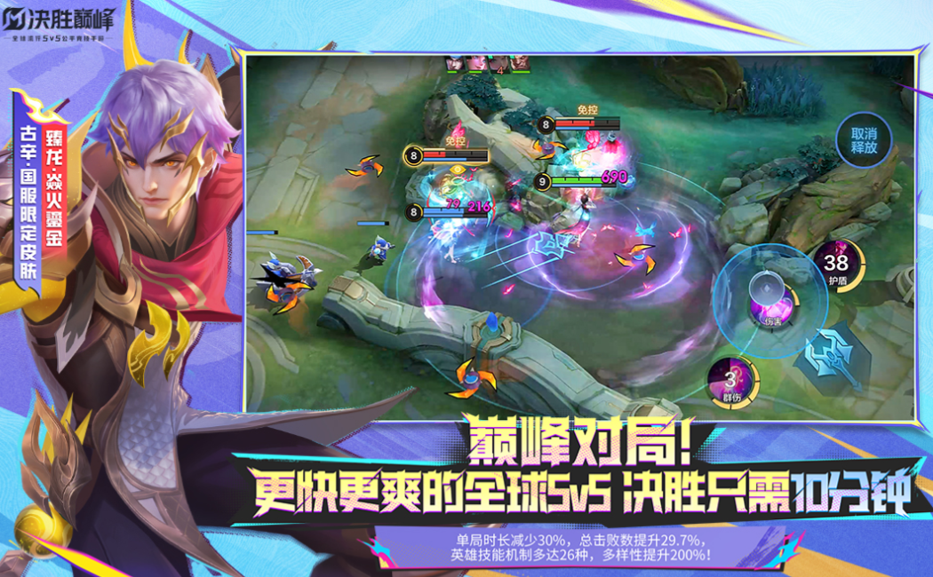 决胜巅峰是拥有国风特色的线上竞技类推塔游戏,仅需十几分钟就可以完成推塔任务十分酣畅,游戏画面做工精致犹如CG电影一般,特效满天飞带来的视觉冲击也很强,采用三按键双摇杆的体系操作起来更自由,游戏考验团队合作能力能让玩家尽情与队友互动,高交互性的推塔互动理念乐趣无限。