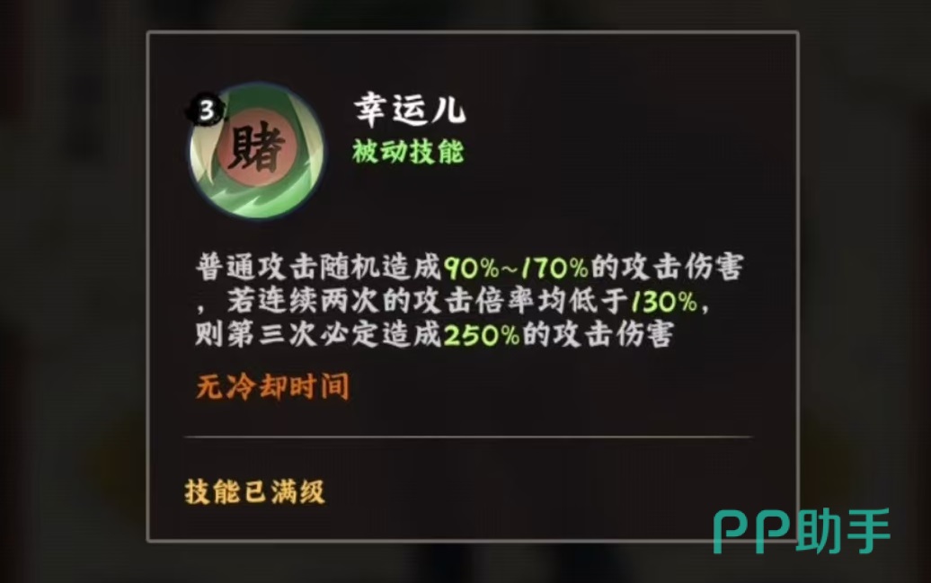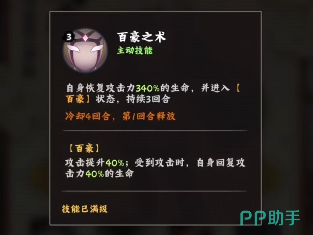 纲手的主动技能百豪之术,自身恢复340%的生命,并进入到百豪状态,该状态持续三回合,在此状态下攻击提升40%,受到攻击时,自身会恢复40%攻击力的生命值。第1个被动技能幸运儿,普通攻击会随机造成攻击伤害,数值在90%~170%之间波动。如果连续两次的攻击倍率均低于130%,那么第3次必定会造成250%的攻击伤害。