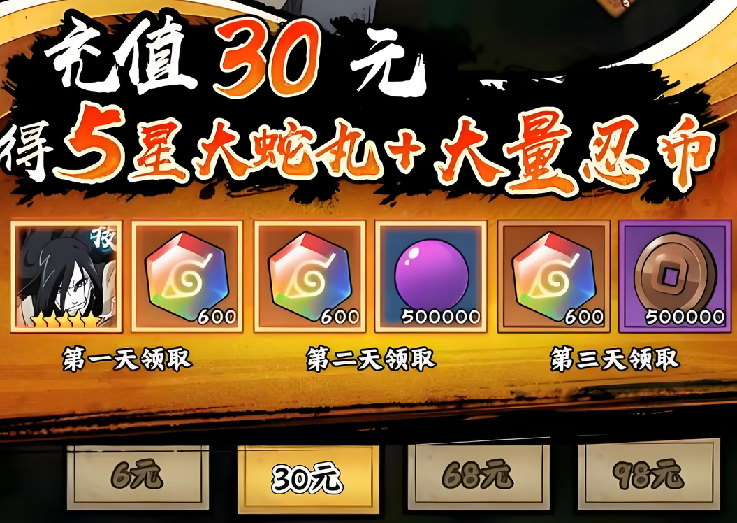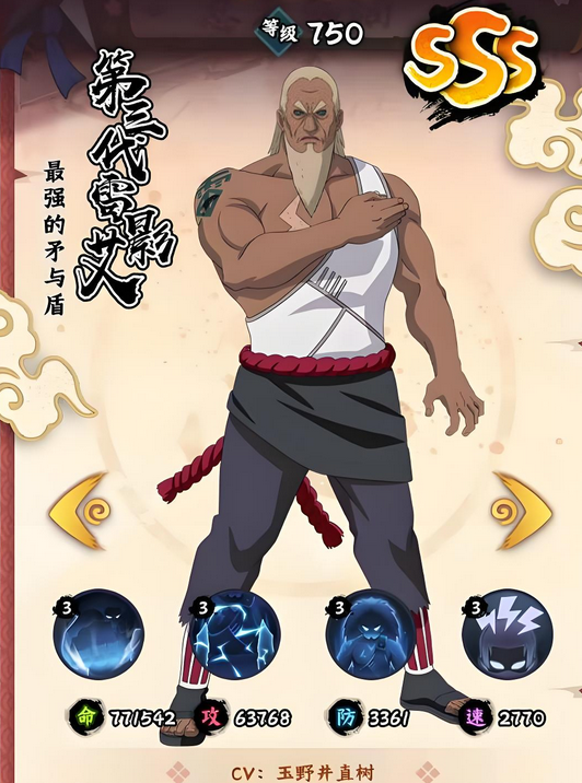 在游戏中通过首充就可以直接获得大蛇丸,这也是很多玩家都会使用这个忍者的重要原因。另一个原因就是自身的技能非常强悍,无论是主动还是被动都是如此。大蛇丸的主动技能三重罗生门,对敌方全体造成100%攻击力的伤害,每击中一个敌方角色,都有50%的几率,给大蛇丸附加一层抵御效果。每带有一层抵御,可提升5%的抗暴率,在受到必杀技攻击时,会反弹部分伤害此,效果最多叠加到5层,每层持续4回合。