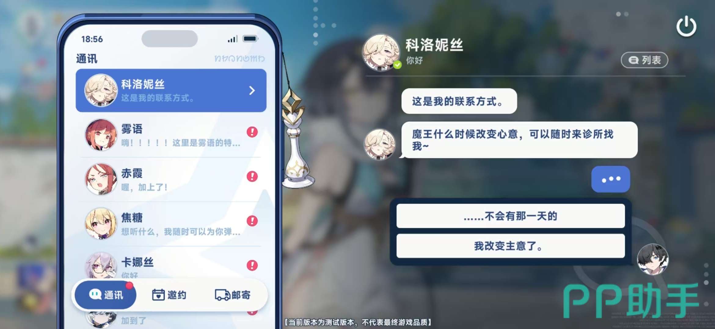 当大家获取到不同的角色之后,都会作为联系人添加到心链的通讯列表中。日常可以和她们进行聊天,在聊天的时候可选择不同的选项进行应答,触发不同回复内容。所有已经出发的聊天会话,都可以在这里直接查看到,就和大家日常使用其他的聊天工具一样。可以自由的查看已经完成或者是没有完成的对话。玩家每天可以向角色发起5次邀约,在邀约中有特殊回忆任务中,完成之后就能提升好感度。
