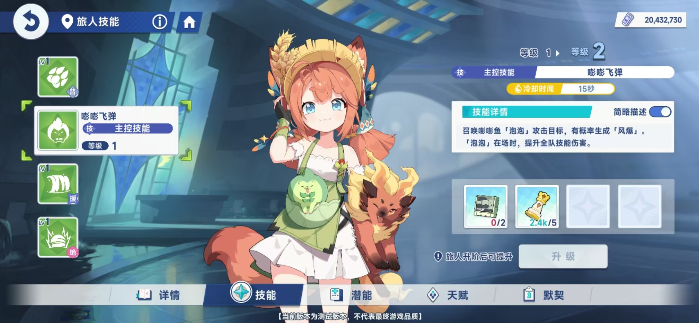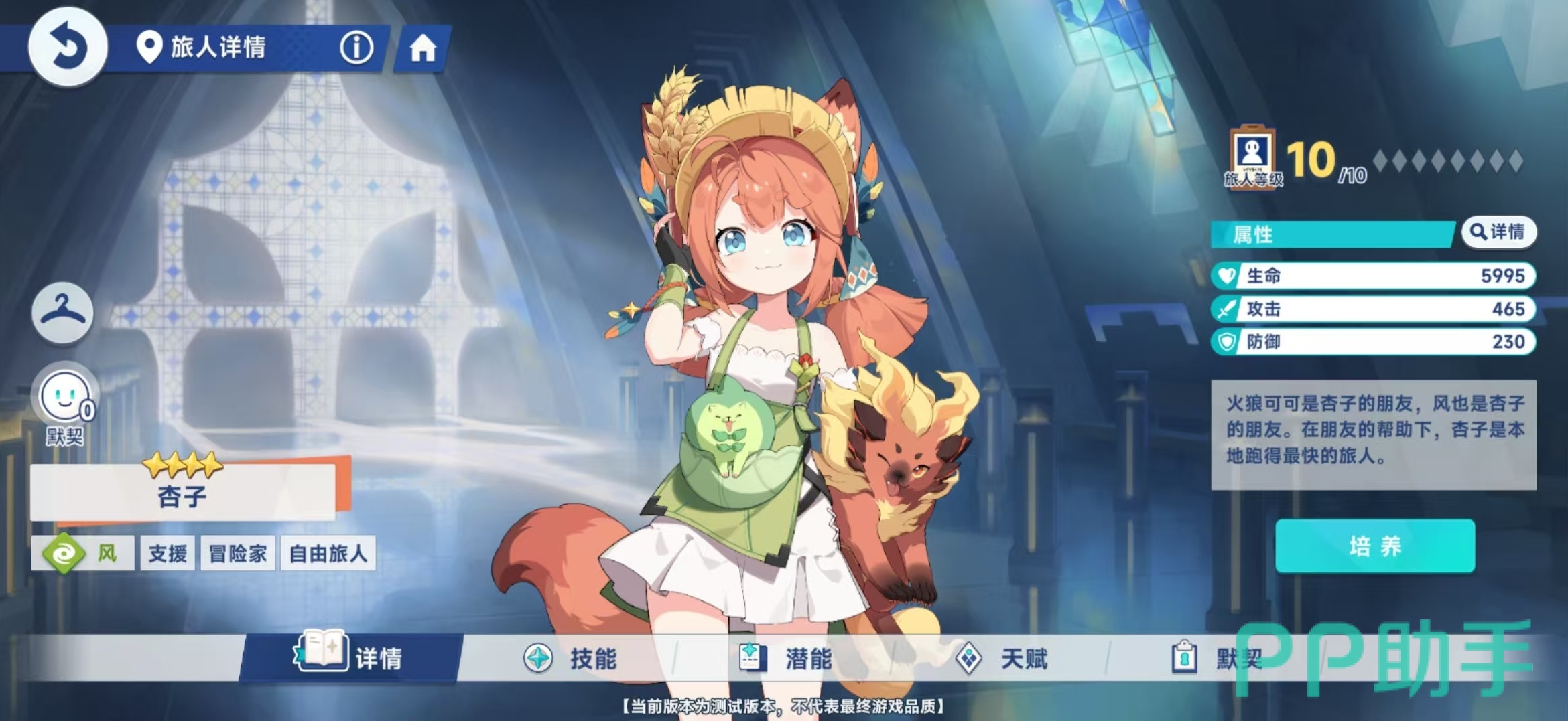 杏子是属于风属性的支援型角色,在技能方面,普攻技能伶牙俐齿,召唤出火狼对目标进行连续扑咬,造成风系伤害。主控技能嘭嘭飞弹,召唤出嘭嘭鱼泡泡,喷射出飞弹造成风系仆从伤害。召唤出来的泡泡拥有杏子100%的攻击力,存在15秒钟。泡泡造成伤害时,有25%的几率生成风暴,造成风系仆从伤害,并附加风系印记。该效果每秒钟最多触发一次。当泡泡在场上的时候,全队技能伤害有额外加成。