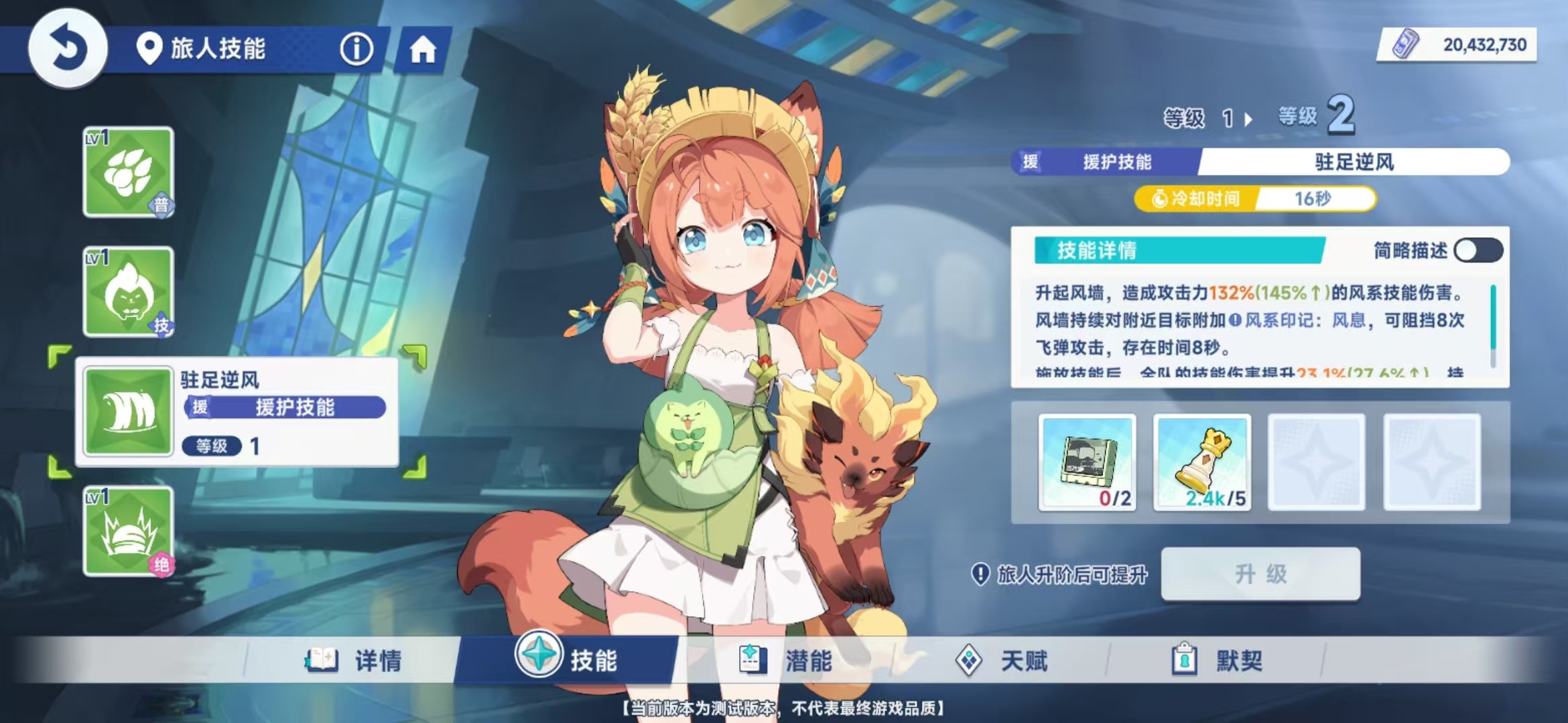 援护技能驻足逆风,升起风墙造成风系技能伤害,风墙会持续对附近的目标附加风系印记,一共能阻挡8次飞弹攻击,存在8秒钟。在技能释放之后,全队的技能伤害提升持续15秒。绝招原野之唤,将飞弹攻击清除,随后发射火球,造成大范围的风系伤害,并附加风系印记。这里简单介绍一下风系印记,这是部分风系角色对目标的额外附加状态。当此状态被特定的风系角色攻击触发时会产生特殊效果,所以杏子很适合与其他的风系角色一起搭档。