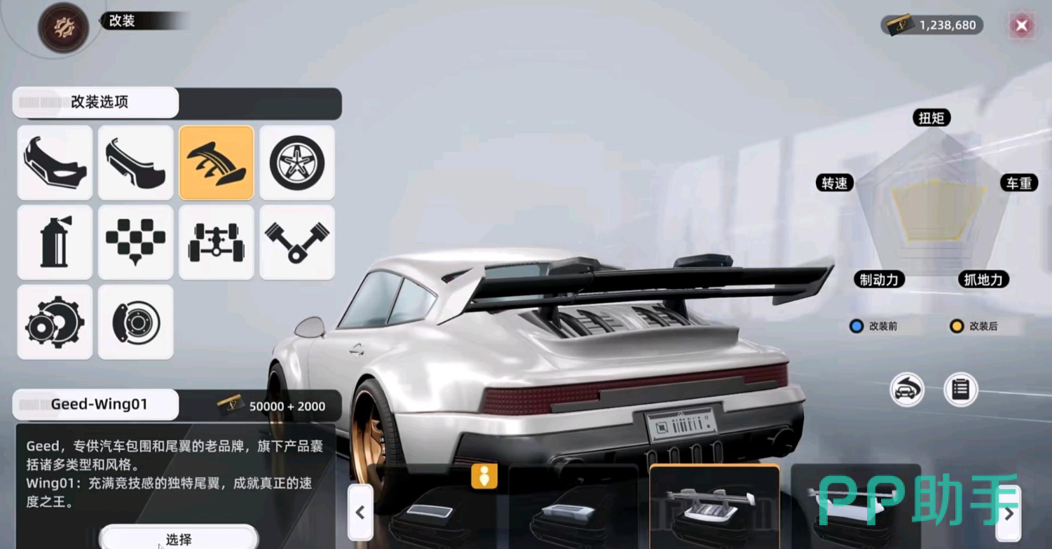 点击改装就可以对车辆做出各种改动,比方说车尾可以换成鲨鱼车尾,让车子像赛车一样,轮胎可选防滑的,前面可以加一个能耐撞击的保险杠,除了这些车辆配件外,颜色也可以自由选择,大家可以自由挑选喜欢颜色,让车辆变得更加生动,最后选择完毕结清改装费用即可完成改装。