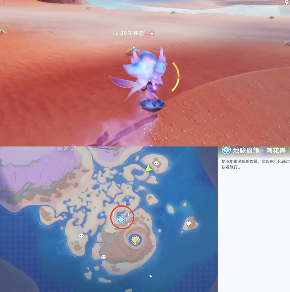 花芽蟹,先传送到地脉晶簇·潮花岸,落地后转动视角就可以看到有一只花芽蟹,可以轻松完成捕捉。