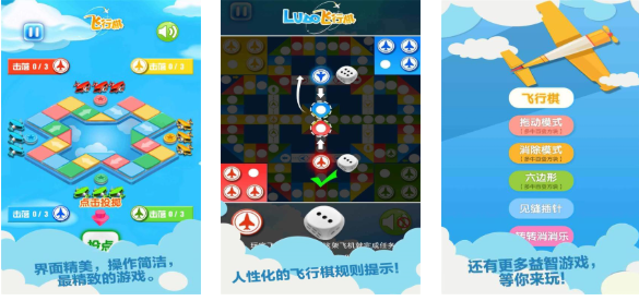 这款飞行棋模拟类游戏具备三维立体的棋盘和特殊博弈理念,众多飞行棋棋子造型等待玩家切换互动,投骰子下棋互动的理念随机性直线提升,色彩渲染不错且背景音效也是飞机的声音,很应景的音画表现让这款游戏更有代入感,还有着六边形拼图以及泡泡龙等有趣休闲的模式可以参与。