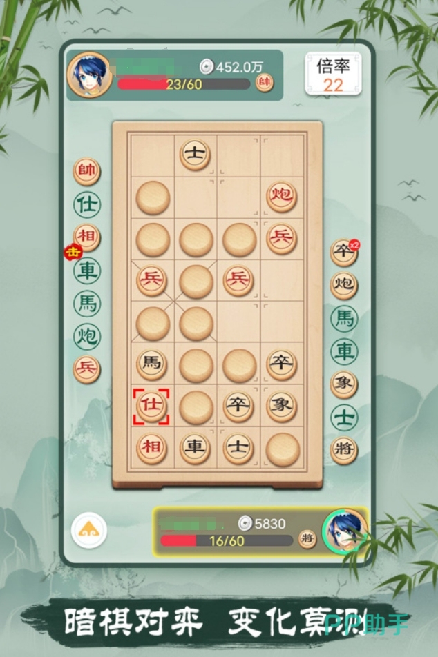 游戏有着很全面的象棋玩法,它不光支持人机对战、联机对战等多种模式,还提供了暗棋对决、残局挑战等玩法,几乎涵盖了所有主流的象棋对战内容,让各位能轻松找到想体验的玩法。同时,游戏还提供了非常智能的人机AI,让各位能在单人模式下进行象棋棋艺训练,而且该模式即便是没网时,也能在打开游戏后直接体验。