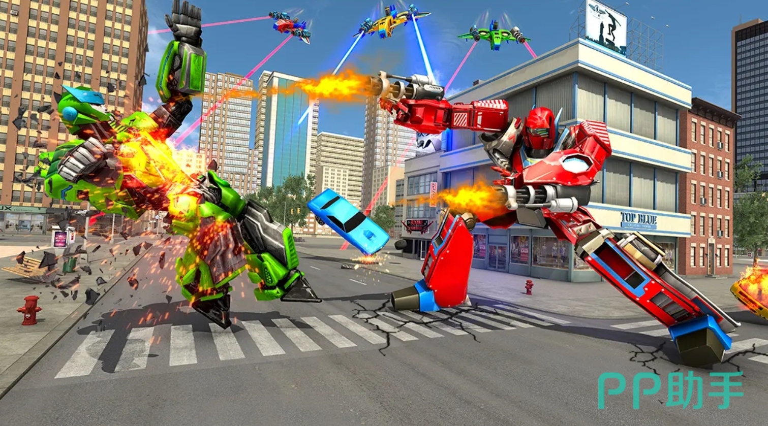 游戏创建了一处以机器人为主的城市战场,各位可挑选自己想使用的机器人在游戏里参战,与敌方机器人在街道上展开大战。里面的机器人可变形为无人机、汽车等,并且在变形后不光保留着它们之前的形象特点,还能在人形态使用出很流畅的攻击招式,配合上高质量的3d画面和极为热血的战斗演出,令游戏的视觉效果十分强劲。