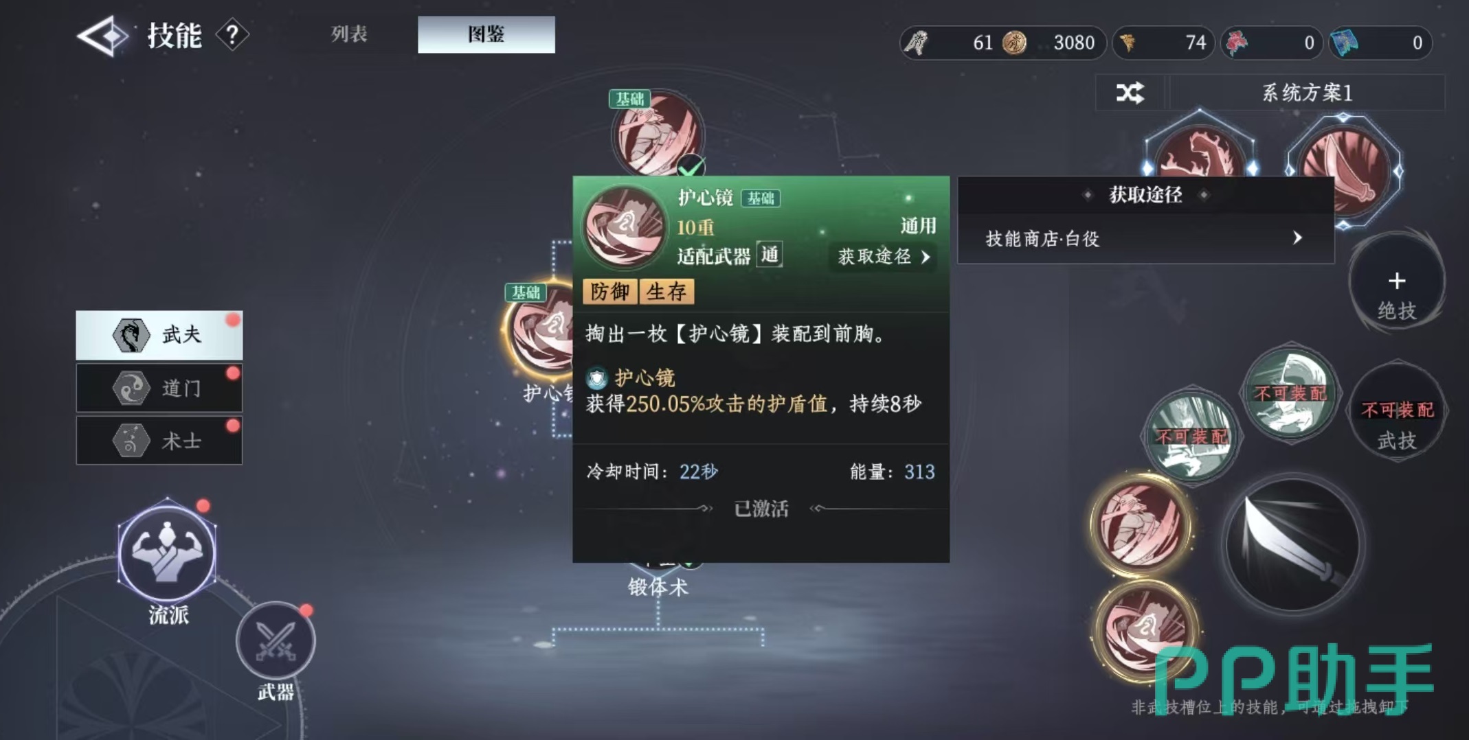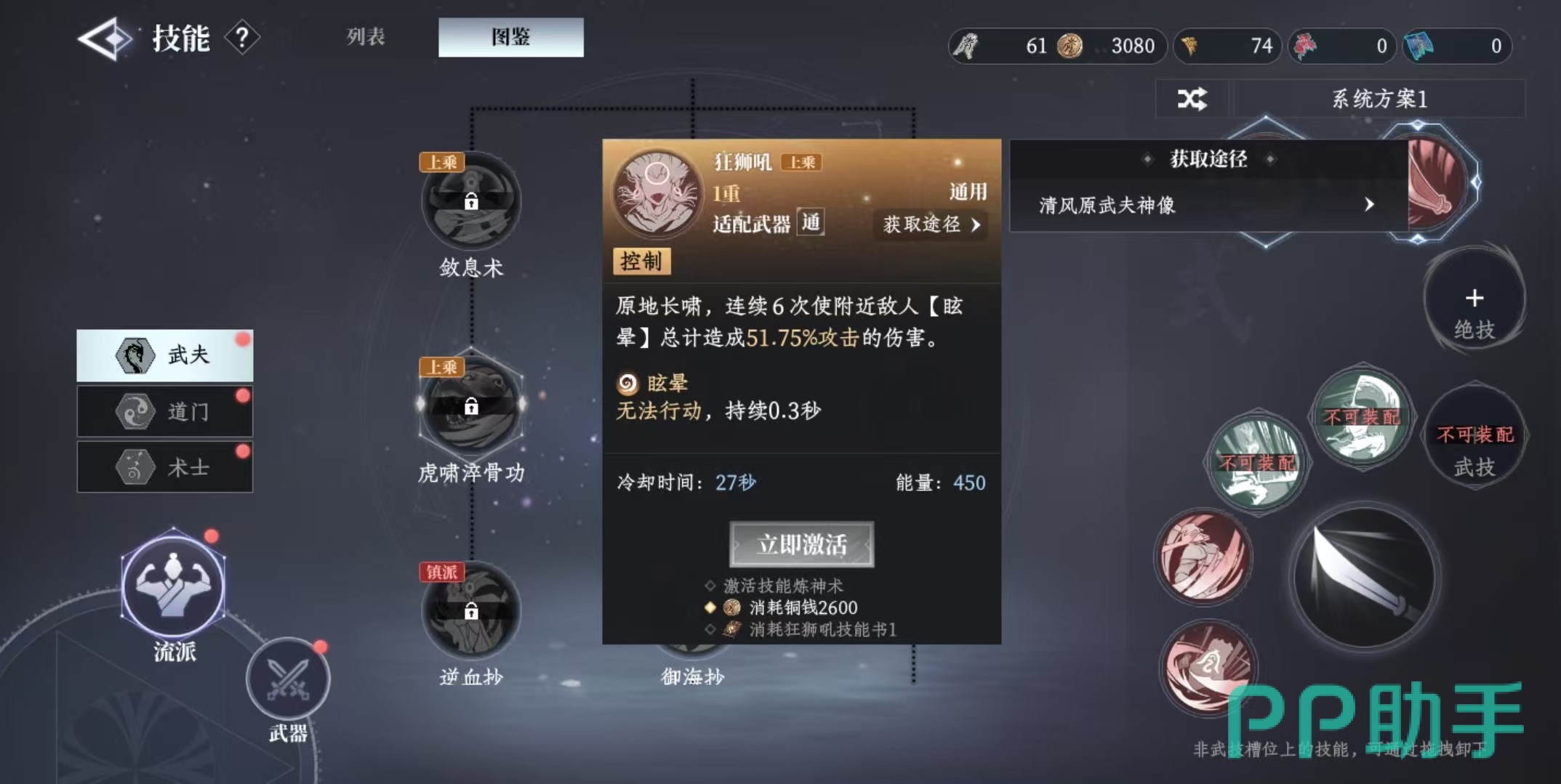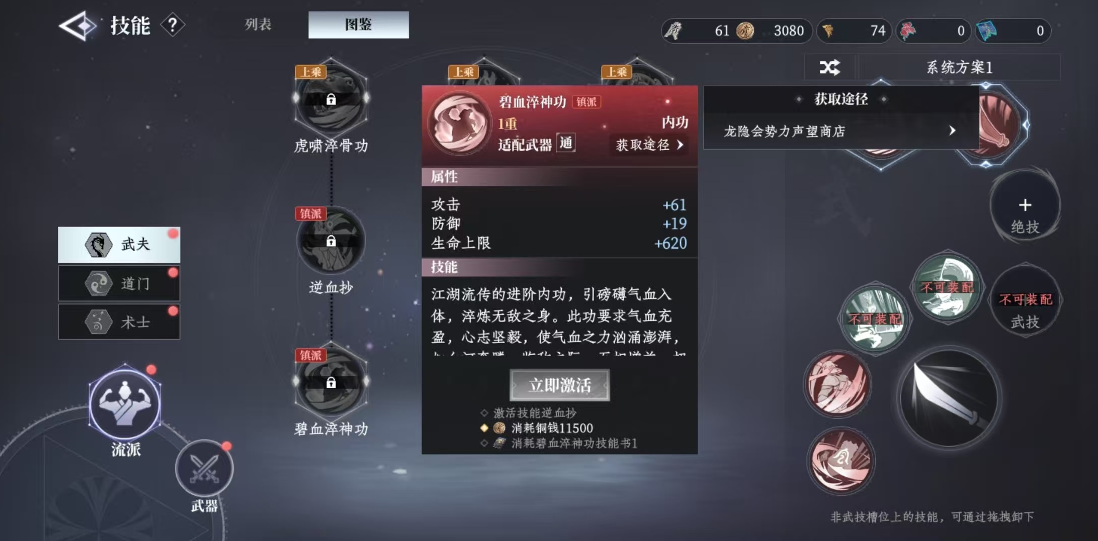 大家在游戏的功能页面中打开技能之后可以看到有当前的三个不同流派,分别是武夫、道门和术士,每个流派都有一系列技能。从基础技能到入门技能以及后续的进阶、上乘、镇派等,都有着多个不同的选项。要想学会这些技能,必须要找到对应的技能书。不同类型的技能获取方式就有所区别,先看一下三个流派的基础技能,除了在对应的神像处就可以直接得到之外,还有一些是需要在技能商人那里购买获得。