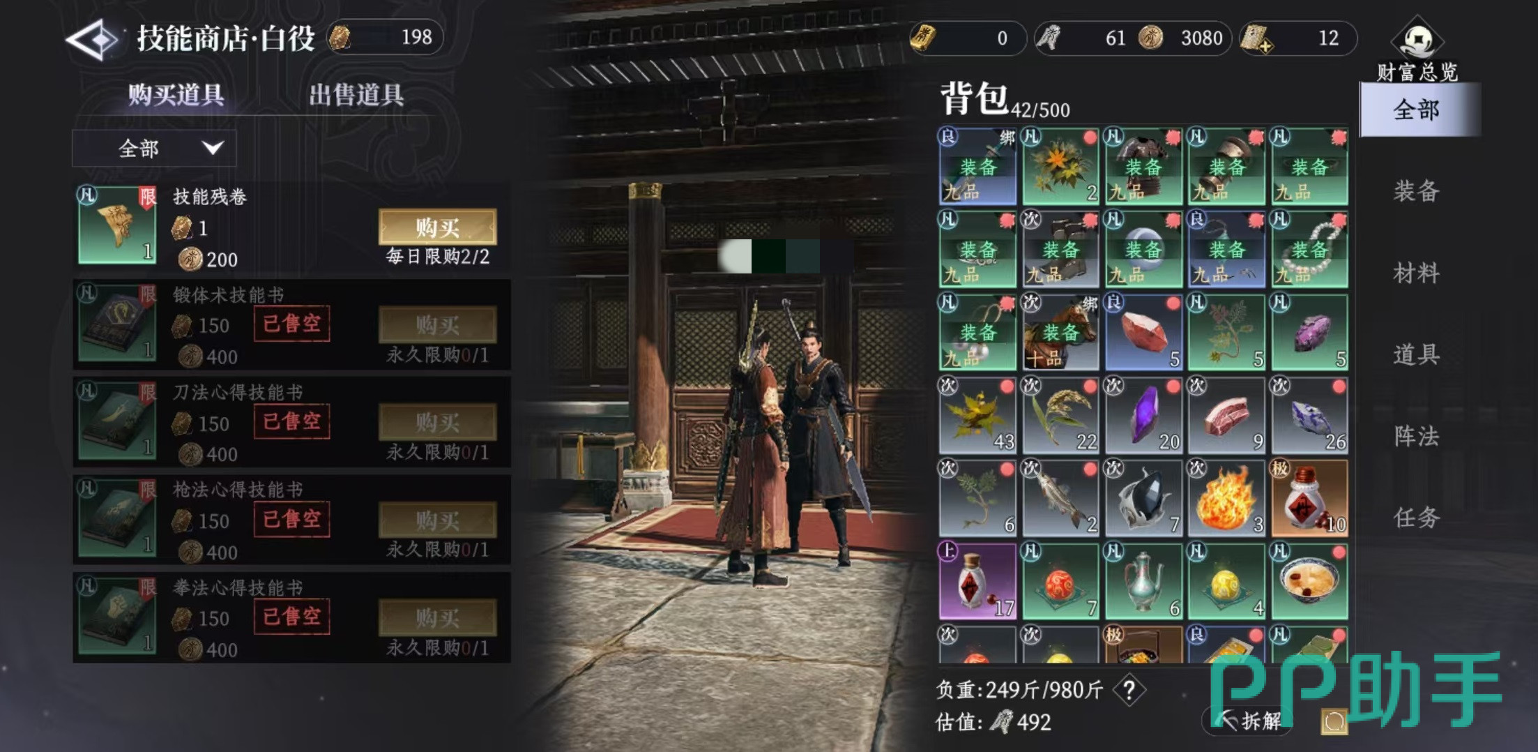 要注意不同流派的技能选择的技能商人也是不同的,大家选定技能之后,可以直接切换到对应的商人处,自动寻路就能找到。玩家在不同品级的时候,所购买到的技能书也是不一样的。例如在打更人衙门属于白役阶段,只能购买到基础技能书,只有提升到了铜锣才可以购买到后续入门技能书。但是升级需要满足一定的条件,不可能一次性将所有的技能都学会,需要比较漫长的过程。