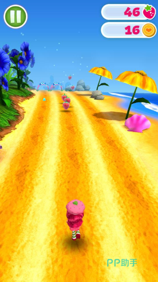 游戏设定在甜心王国,这里被甜蜜魔法笼罩,却因黑暗力量侵扰导致水果资源枯竭。玩家将化身草莓公主,带领伙伴们踏上收集水果、拯救王国的冒险之旅。游戏采用竖版3D跑酷模式,玩家通过左右滑动切换跑道,上下滑动完成跳跃或滑行。沿途需躲避岩石、藤蔓等障碍,同时收集草莓、蓝莓等水果制作蛋糕。游戏采用粉色调Q版画风,搭配轻快背景音乐与水果碰撞音效,营造出轻松治愈的氛围。