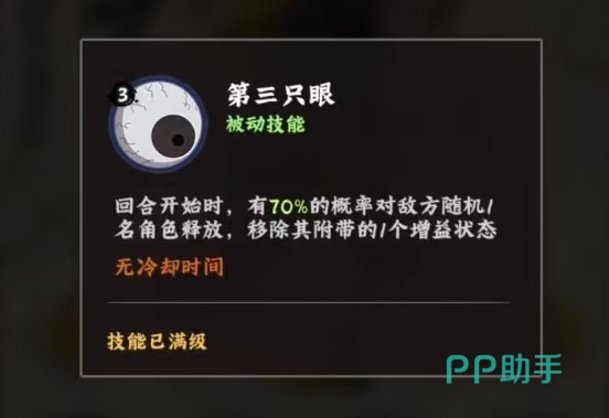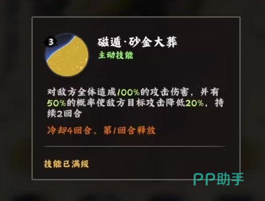 罗砂的主动技能磁遁砂金大葬,可以对敌方全体造成100%的攻击力伤害,并有50%的几率使敌方目标攻击降低20%。攻击降低效果持续两个回合,该技能在第一回合就能释放,冷却四回合。伤害方面因为目标多,所以总量比较客观,更重要的是触发之后的降低攻击,只要能影响到对方的主力,就能起到重要作用。第2个是被动技能第三只眼,在回合开始时,有70%的几率对敌方随机一个角色释放,将其身上附带的一个增益状态移除,该技能没有冷却时间。