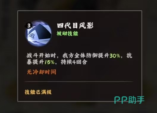 第3个是被动技能四代目风影,战斗开始时,使我方全体忍者的防御提升30%,抗爆提升15%,持续4个回合。这个被动对团队是一个非常有效的加强,不仅增加的数值高,持续的时间也很长,4个回合基本上可以覆盖绝大多数战斗的时间,在生存方面更是提高了一个层次。尤其是在面对开场就打爆发的阵容时,能做到有效针对。第4个是被动技能坚毅不屈,战斗开始时防御提升20%,生命上限提升20%,抗爆提升20%。这是对自己生效的技能,对于己方的生存能力是很大的加强。