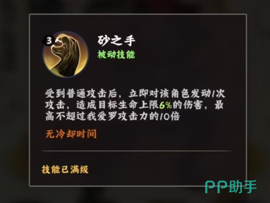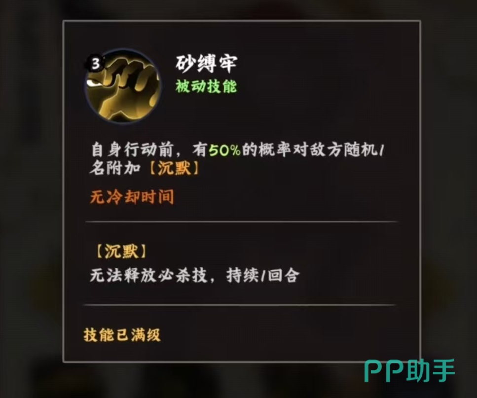 第2个是被动技能砂缚牢,在自身行动之前,有50%的几率对敌方随机一个忍者附加沉默,对方被沉默之后无法释放必杀技,但是可以进行攻击。该技能没有冷却时间,此技能触发概率比较高,只要脸不是很黑,在一场战斗中可以触发多次。如果能够开局就沉默住对方的核心输出,对于越战力挑战是很有帮助的。所以很多战斗可以多尝试几次,赌一赌触发几率的目标。