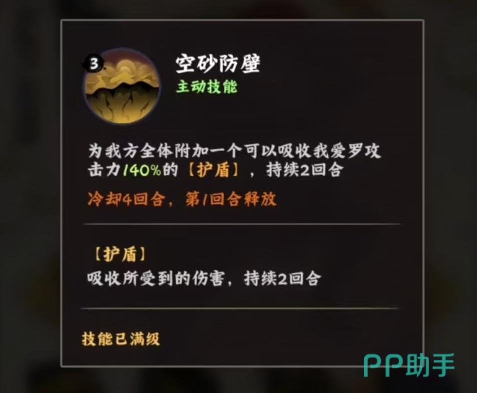 我爱罗是属于心类型的忍者,它的品级为SSS,是游戏中目前最顶级的忍者之一,大家通过他的介绍,守护村子的盾牌,就可以看出他在团队中的作用。第1个是主动技能空砂防壁,为我方全体忍者添加一个可以吸收伤害的护盾,该护盾是根据我爱罗的攻击力百分比来进行添加,持续两个回合。第1回合就能直接释放,冷却四回合。这个技能直接奠定了我爱罗这个忍者在目前阵容搭配中的地位。全体护盾带来的是团队整体生存能力上升,这要比直接进行治疗还要有效。