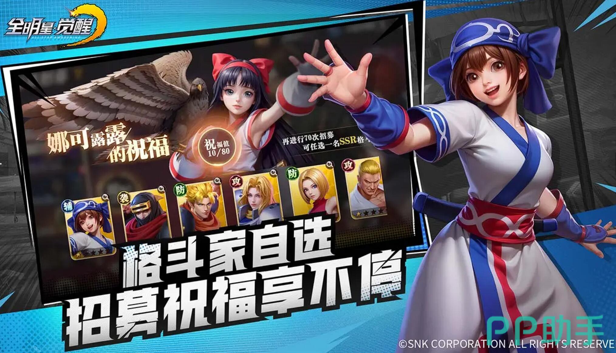 全明星觉醒是个由SNK正版授权的策略卡牌手游,融合了经典格斗IP与创新玩法,为玩家带来兼具怀旧与新鲜感的游戏体验。今天为大家分享一下全明星觉醒测试版下载。本作集结了拳皇、侍魂、合金弹头,等经典作品中的50多位人气角色,如八神、草薙等,以3D动态场景和策略卡牌战斗为核心,让玩家在熟悉的角色与全新的玩法中感受格斗宇宙的魅力。