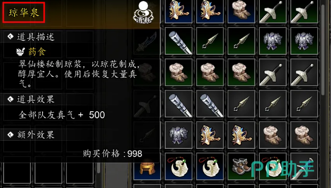 进入交易界面后,你会看到琼华泉的选项,这时候直接选中它并支付998钱币。可以说花钱购买这个物品是值得的,毕竟获得一个有着特殊效果的物品,绝对是提升实力的一大助力。琼华泉拿到手后,它所带来的好处相信你会感受到:无论是战斗中增加的优势,还是对角色状态的加持,它的作用都非常明显。