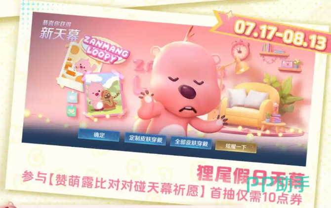 本次更新还带来了一大波粉色系全新内容,可谓是女性玩家们的专属节日。从7月17日起,粉色狸尾假日天幕正式上线,通过参与天幕祈愿抽奖活动即可有机会获得。这款天幕以粉嫩温馨为主色调,为游戏画面增添了梦幻般的浪漫气氛,是搭配Loopy联动皮肤的绝佳选择。