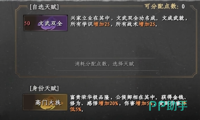 既然是完美开局,那么给我们自己增加天赋点数的肯定不考虑了。这其中点数足够的话建议需要选择太阴和太阳这两个,这两个天赋会让我们本身在修炼任何功法都有着极高的优势,同时在发挥战力方面也比一般的要强上许多。基本上只要可以选中这两个天赋的话就可以算得上完美开局了。其余的天赋玩家们如果还有着天赋点数的话可以酌情进行考虑,接下来选择一些非战斗属性,接着选择难度便可以进入游戏。