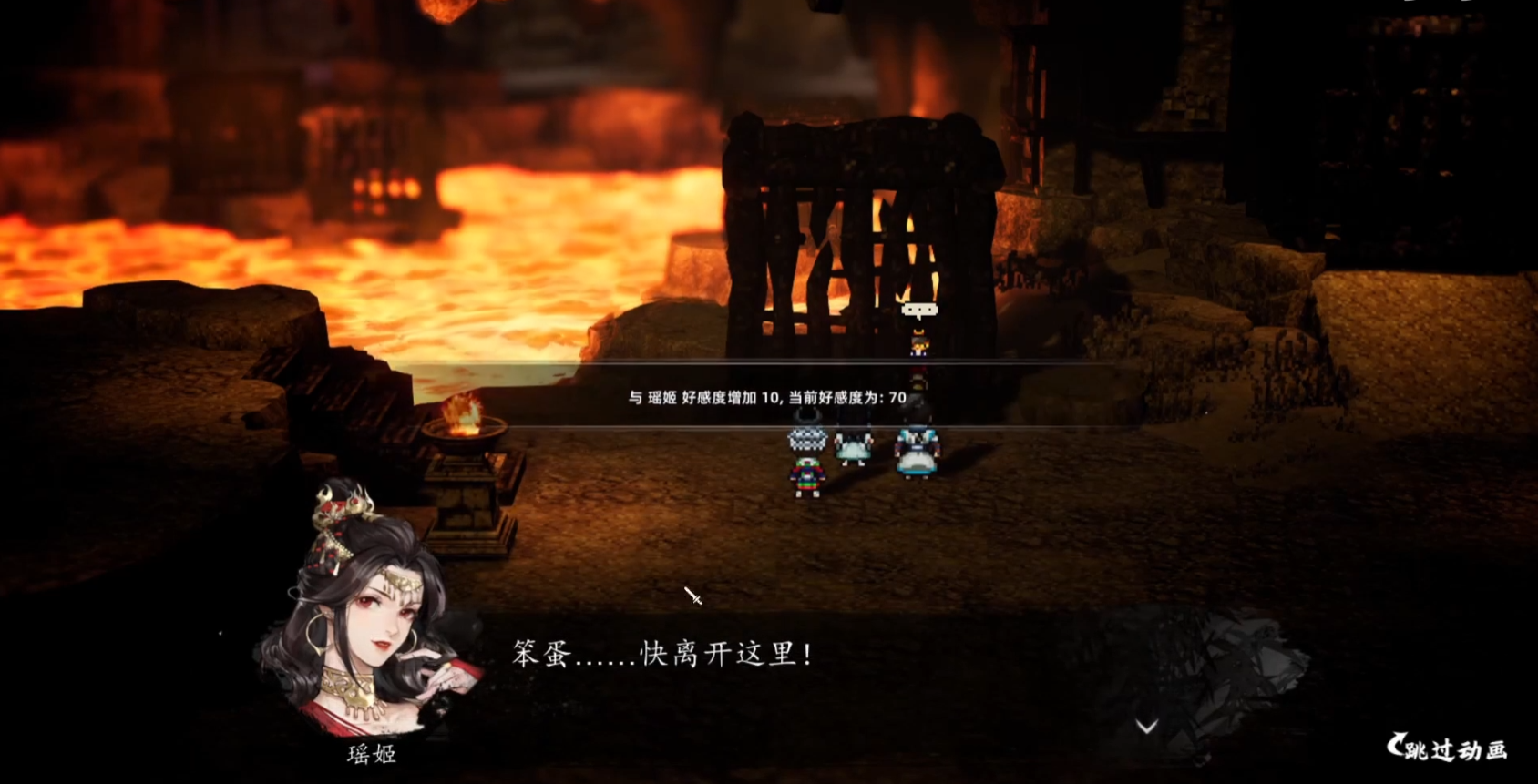拿到钥匙后,我们回到最开始的位置,也就是玄火教内部的入口。一直往右走,就可以找到羁押犯人的玄火教牢狱。一直往里头走,穿过好几名敌人之后,我们就能找到关押瑶姬的笼子,随即就能触发剧情了。而瑶姬也是告诉我们,之所以能如此轻易的找到她,是被人下套了,之后便是一场剧情战。