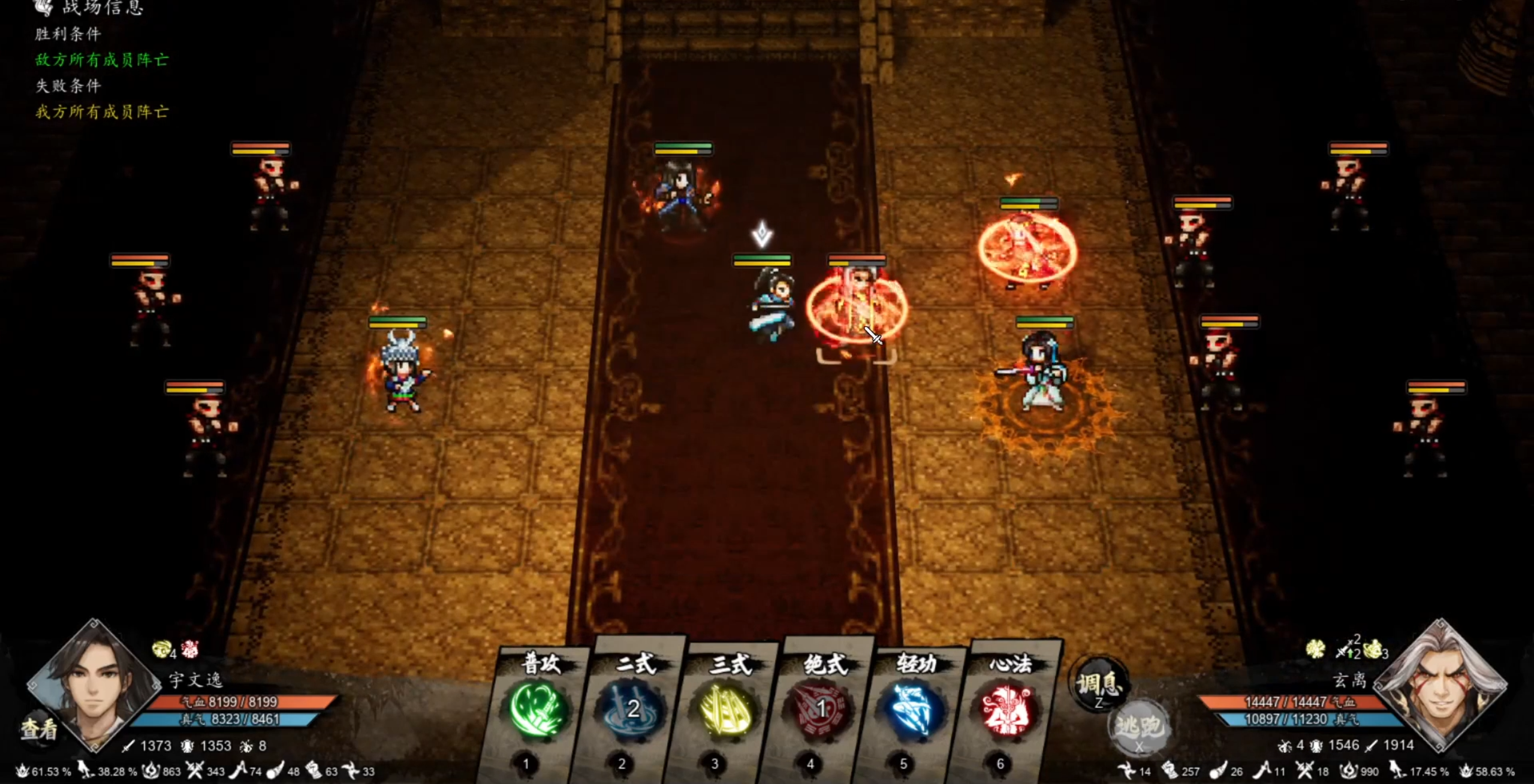 玄离可谓是超级弱,因为使用的是拳系招式,而我们这场战斗又是多人战,难度可谓比正派连战还低,但是小兵比较恶心,建议让其它队友处理一下。这里我们可以偷一个背刺,进入战斗一直往右走,就可以了。