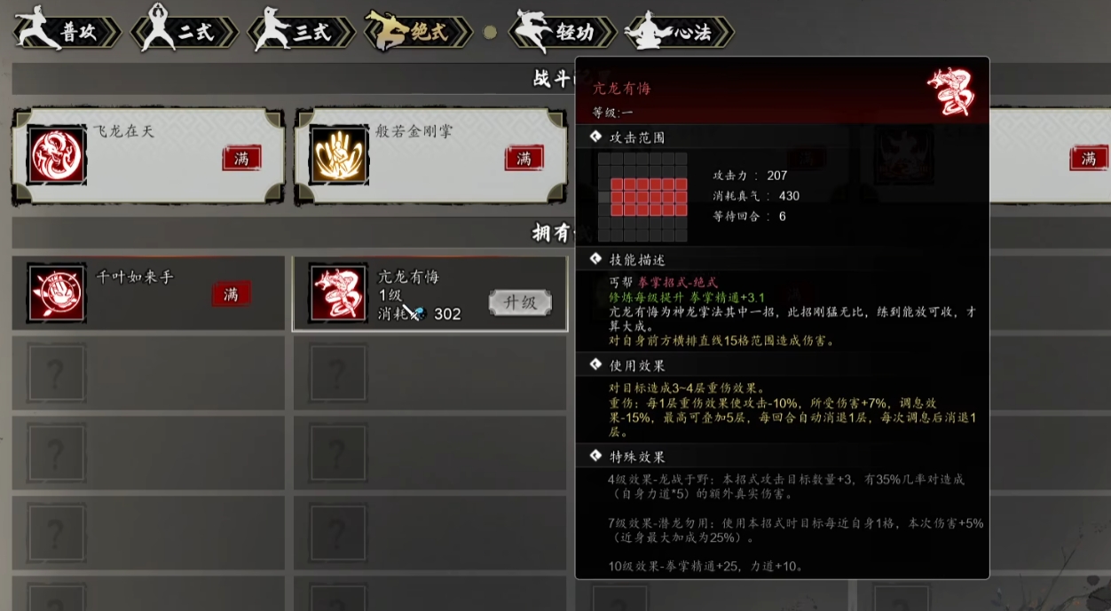 今天小编给大家带来的是逸剑风云决亢龙有悔武学介绍的内容,在逸剑风云决的武学系统中,亢龙有悔以拳掌类群体攻击为核心特性,凭借独特的重伤效果与层级化成长机制,成为兼具战术价值与操作深度的代表性技能,获取流程与角色好感度、场景探索紧密关联,构建起技能解锁与剧情推进的联动体系,接下来跟小编一起来看看这个武功吧。