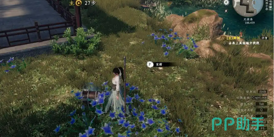 无涯岛作为新手引导,任务设置轻松易懂。玩家只需要巧妙躲避岛上守卫的目光,收集一些基本的药草和矿石,任务便能顺利完成。这一段既是游戏操作的引导,也是对剧情背景的铺垫。值得注意的是,这里的资源收集提示非常直观,地上的药草、矿石等物品会通过蓝色光芒突出显示,玩家可以通过这些亮点轻松找到需要收集的物品。而岛上的宝箱同样显眼,玩家只需靠近即可打开,获得一些基础奖励。