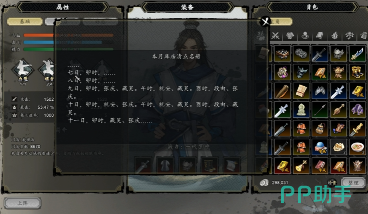 与张庆、典航等弟子的互动中,可收集到近期库房看守频繁换班、有弟子深夜在库房附近徘徊等反常现象描述,这些碎片化信息为后续推理提供了方向,实物勘察是锁定内鬼的核心环节。库房中央的木箱需进行三次细致检查,前两次检查仅能确认物品存放状态,第三次检查时会发现箱底暗格的细微松动,从中找到一枚损毁的铁砂弹丸,其破损痕迹与火器受潮后的性能异常存在直接关联,右侧墙角堆放的油纸油布同样隐藏线索,选择继续调查可发现布料边缘残留的不规则水渍,以及与常规存放方式不符的褶皱形态,暗示曾有人违规接触防潮物资。