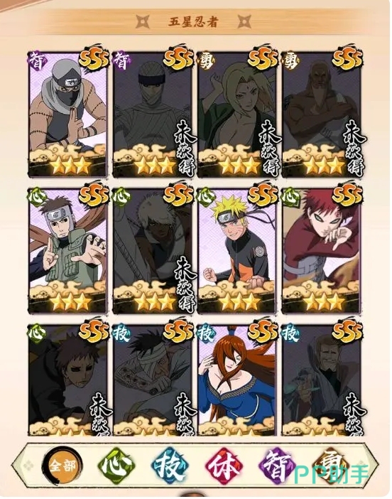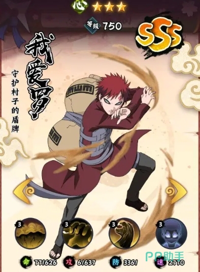 还有我爱罗+卡卡西+纲手+自来也这个阵容也不容小觑,我爱罗那强大的防御能力和独特的技能,能在前排扛住敌人的攻击,卡卡西的追击和爆发能力依旧出色,能在战斗中不断地给敌人制造麻烦,纲手和自来也这对老搭档,一个擅长治疗和防御,一个输出能力惊人,他们的存在让整个队伍的实力更加均衡,下面再给大家详细介绍一下各个角色的特点和定位。