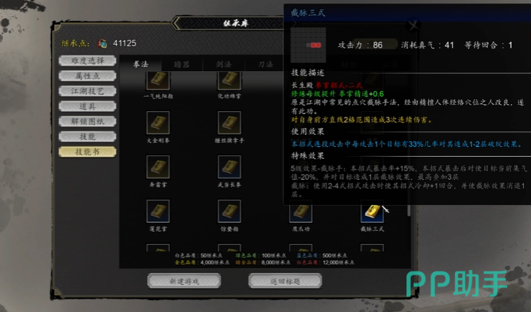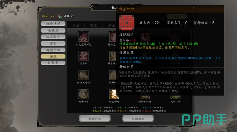 心法的选择与继承同样关键,,易筋经作为一种强力的心法传承,对提升角色输出能力效果显著,在二周目开始时若玩家将部分继承点用于解锁易筋经,能让角色在战斗中的输出表现得到质的飞跃,在面对前期敌人时更具优势,武功流派的构建需要玩家根据个人喜好来分配继承点,游戏内存在多种武功流派,每个流派都有其独特的武学招式与战斗风格,玩家确定心仪流派后,可挑选该流派核心武学进行继承。