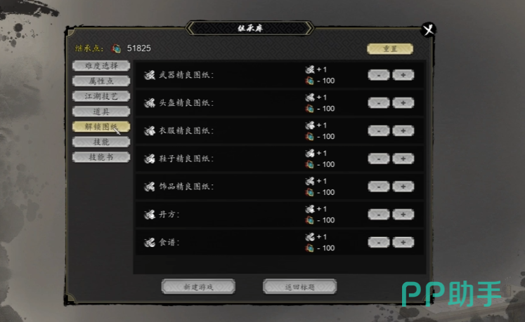 武器方面虽然不建议投入过多继承点,但适当分配仍有意义,一品武器能在二周目前期直接提升角色攻击属性,为前期战斗提供助力,玩家可投入少量继承点获取,并且一品武器分解后可得到前期难以获取的陨铁锭,用于后续锻造更高级武器,从长远来看对角色成长有益,图纸的继承也不容忽视,高级帽子图纸值得玩家关注,尤其是四品及以上的帽子,这类帽子在游戏中可提供每回合回血效果,这在持久战中能极大增强角色的生存能力。