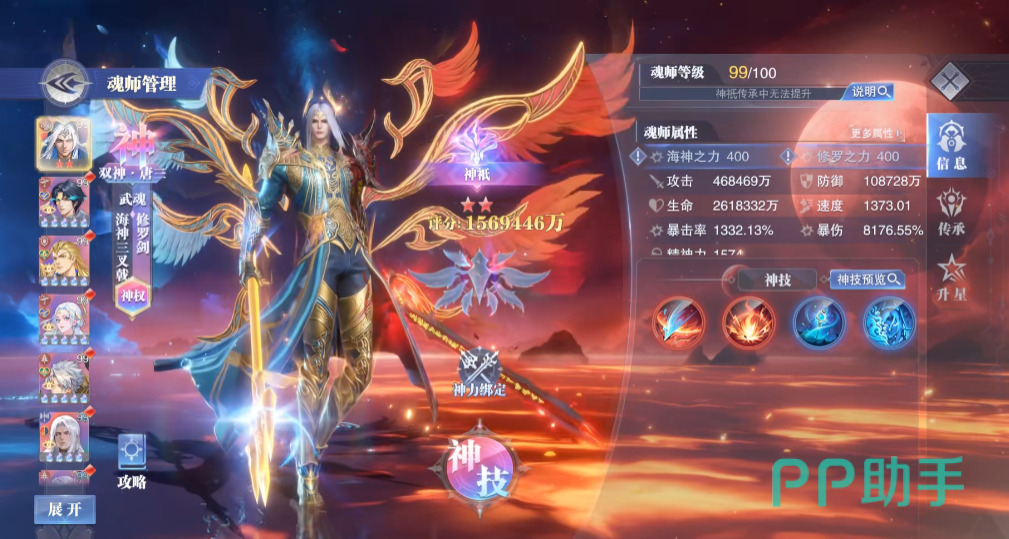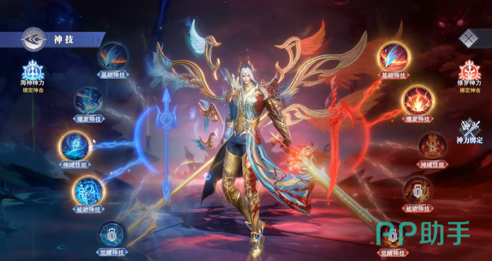爆发神技:海神和修罗神均需要消耗4000点神力,能对敌方全体造成3000%攻击力的伤害,前者无视意志值各添加3层海狱烙印;后者给敌方全体添加2层的修罗神威。