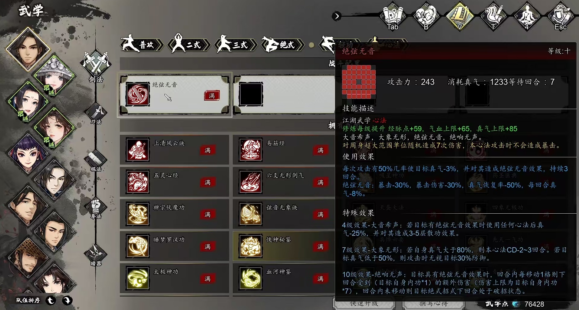 升到7级时附加激活大象无形,如果当前自身真气大于80%,则本心法的cd减少,如果目标真气低于50%,攻击时无视部分防御。升到10级时触发绝响无声,对方带有绝弦无音效果时,在回合内每移动1格,下一回合就会受到额外伤害。在搭配使用的时候,可以和天机剑法搭配起来,可以弥补天机剑法前期启动速度慢的劣势。还可以和其他输出型的心法搭配,例如惔神秘鉴等增加暴击的心法,或者是霹雳心法等,进一步强化伤害效果。当然也可以和一些辅助型的心法搭配,更好的保障生存。