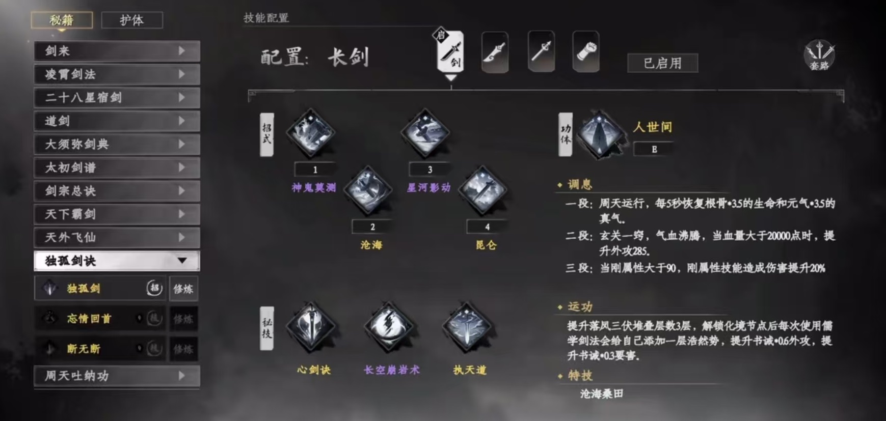 独孤九剑在游戏中秉承了无招胜有招的设计理念,其总决式可以根据敌方弱点,给对方造成致命一击,打出较高的伤害。目标身上每带有一层破绽伤害,还有额外的加成。另外独孤九剑中还有破拳式、破剑式、破刀式、破棍式等,可根据对方手中的不同武器类型攻击进行招式反架,并给目标身上留下破绽效果降低其防御。在百级精进修炼之后,总决式的伤害还能进一步提升,可以让任何武器都能获得属性加成,普攻也能进化为真实伤害,可无视对方一定免伤属性。