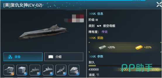 复仇女神号航母在游戏当中属于三级航空航母,作为传说级别的品质,具体的特点就是拥有4座飞行甲板,同时具有潜行的特色能力。装备数量较为庞大,拥有极强的防御能力以及攻击力,在战斗的过程当中能够展现出无限魅力。具体的耐久度相当高为559000.速度为15.2节,虽然与其他航母相比较起来速度并不高,但是在持续战斗时能够做到全身而退。