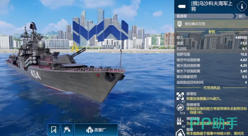 假如玩家的等级已经达到15级,那么最推荐的船只就是,乌沙科夫海军上将驱逐舰,这个船只会拥有双导弹系统,同时还有双主炮和双火箭炮,这样可以让玩家在对战的过程中有更强的实力,超强的火力可以应用各种不同的对手,同时这个船只还搭载着一座鱼雷,加上一架直升飞机,玩家可以在水面以及空中,展开一场立体的战斗,比较喜欢火力型船只的玩家可以选择这个舰船。