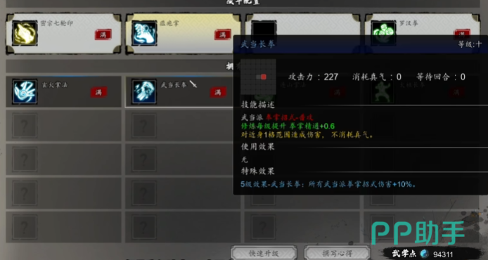 步入游戏中期玩家对游戏机制有了一定了解,此时可着手对拳法搭配进行优化升级,绵掌与瘟庖掌的组合颇具威力,绵掌能有效增加目标所受伤害,瘟庖掌则可持续削减目标的回复能力,二者配合在战斗中既能提升自身输出效果,又能限制敌人的续航,为战斗胜利增添筹码,此外中期还可引入太极拳这一武当绝学,太极拳以柔克刚,独特的招式机制在战斗中可发挥出不俗的控制与防御效果。